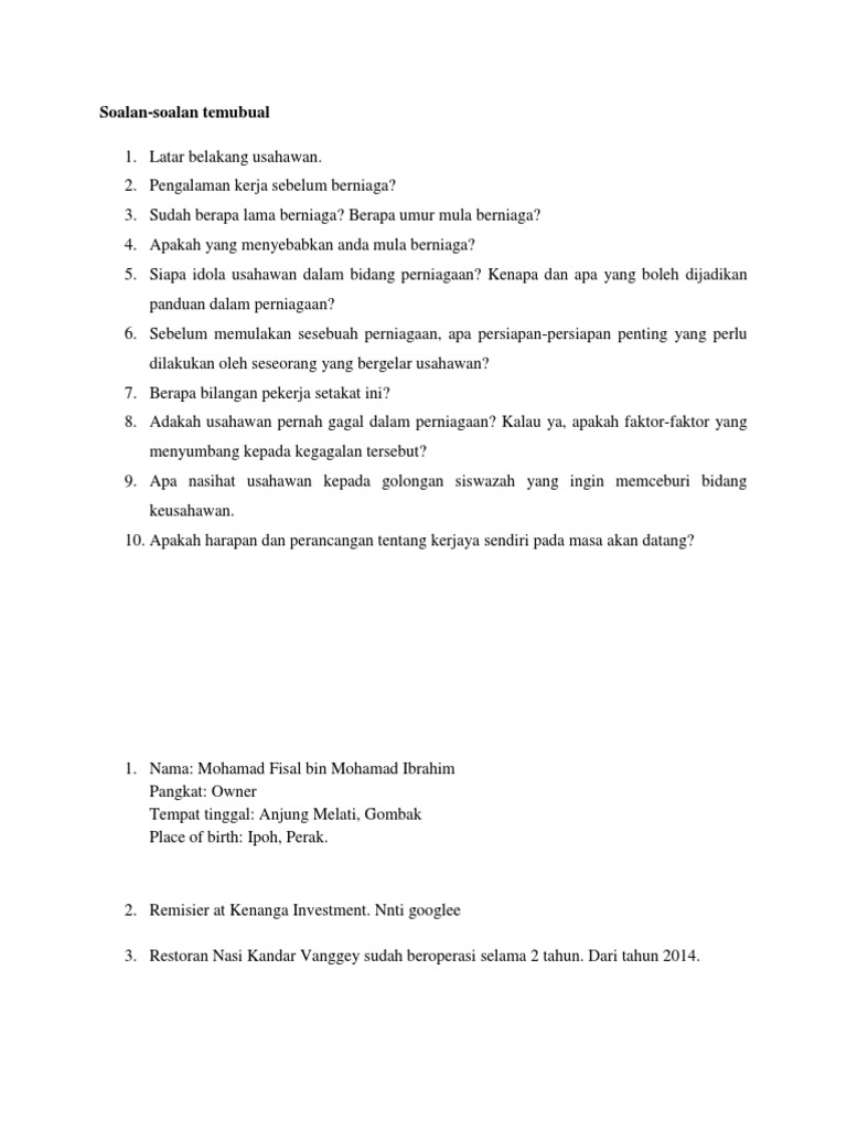 Soalan Temubual Usahawan Docx Soalan Temubual Usahawan Latar Belakang Perniagaan 1 Nama 2 Tarikh Lahir 3 Tempat Lahir 4 Adik Beradik 5 Course Hero